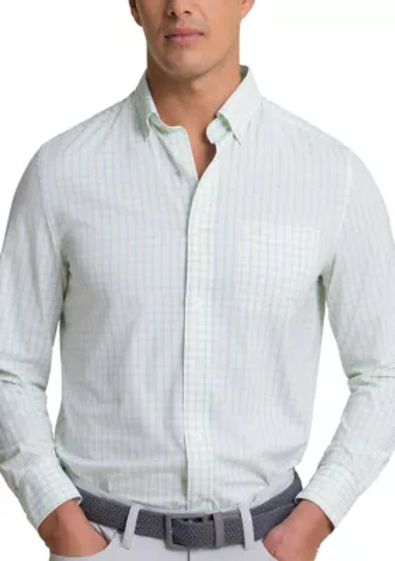 Experience ultimate comfort and performance with this versatile button-down shirt from Southern Tide. Crafted from a quick-drying, wicking nylon and spandex blend, it offers superior stretch and UV protection. Designed with a classic button-down collar, adjustable cuffs, and a convenient chest pocket, this shirt ensures a comfortable fit. The subtle plaid pattern and branded buttons add a touch of sophistication, while the Skipjack embroidery provides a signature detail. Button-down collar Long sleeves Left chest pocket Eyelets under arm Sleeve placket with 2-button adjustable cuff Plaid pattern Imported Material & Care 91% nylon, 9% spandex Machine washable