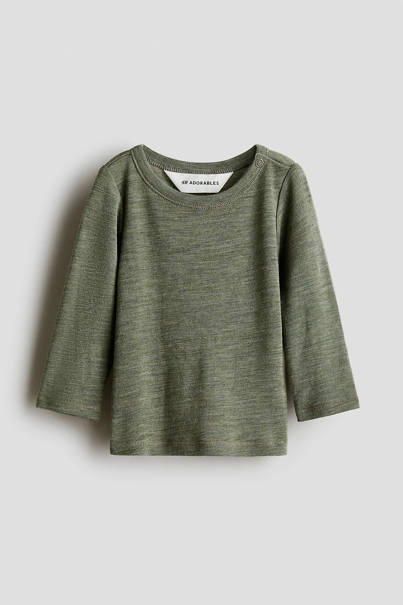 H&M Adorables. Long-sleeved shirt in soft jersey made from merino wool with a smooth feel on skin. Round neckline with snap fasteners at one side (sizes 2–4Y without snap fasteners). Merino wool is naturally temperature regulating, comfortable, and long-lasting, providing many years of wear. The H&M Adorables collection is a curated selection of high-comfort, quality pieces with a timeless appeal.