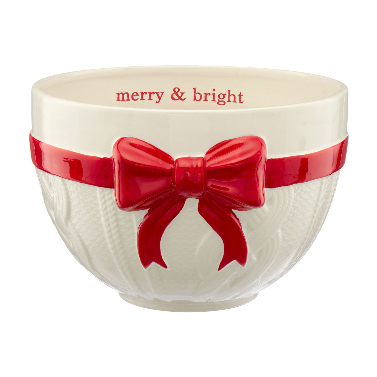 Crafted from high-quality ceramic, this bowl features a beautiful ivory finish that complements any Christmas decor. The standout feature is the vibrant red bow that wraps around the bowl, giving it a delightful gift-like appearance. The words "merry & bright" are elegantly printed on the inside rim in matching red, reminding everyone of the joyous spirit of the season.