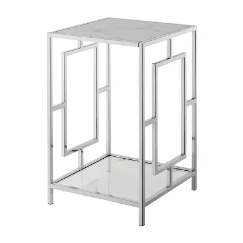 Complete your luxurious space with the town square chrome end table with shelf by Convenience Concepts. This contemporary table will bring glamour and functionality anywhere it stands. Two tiers of spacious shelves offer plenty of room to showcase elegant decor. The top shelf boasts a sleek faux marble finish, and the bottom is thick clear tempered glass. The sturdy chrome metal frame boasts an open-concept design and a beautiful geometric silhouette. Removable shelves make it easy to clean and maintain this unique piece. Simple and easy assembly in just three steps will have you admiring your glamourous setup in no time. Shop coordinating pieces from the town square chrome collection from Convenience Concepts, each sold separately.