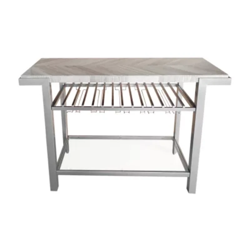 The style on this marble herring bone dining set will be a conversation piece in your dining room! The table top is solid marble laid up in a herringbone pattern. Natural stone with slight imperfections. The steel base on the table and chairs represent the look and quality of this set. The chair sets comfortably with the diamond quilt fabric. The server sets well this collection showing the storage, bottle rack and stem holder.