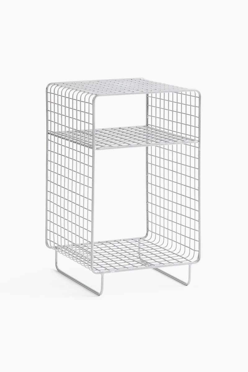 Industrial-design nightstand made of metal wire with softly rounded corners. One shelf with a larger compartment underneath, ready to hold your favorite books and other nighttime essentials.