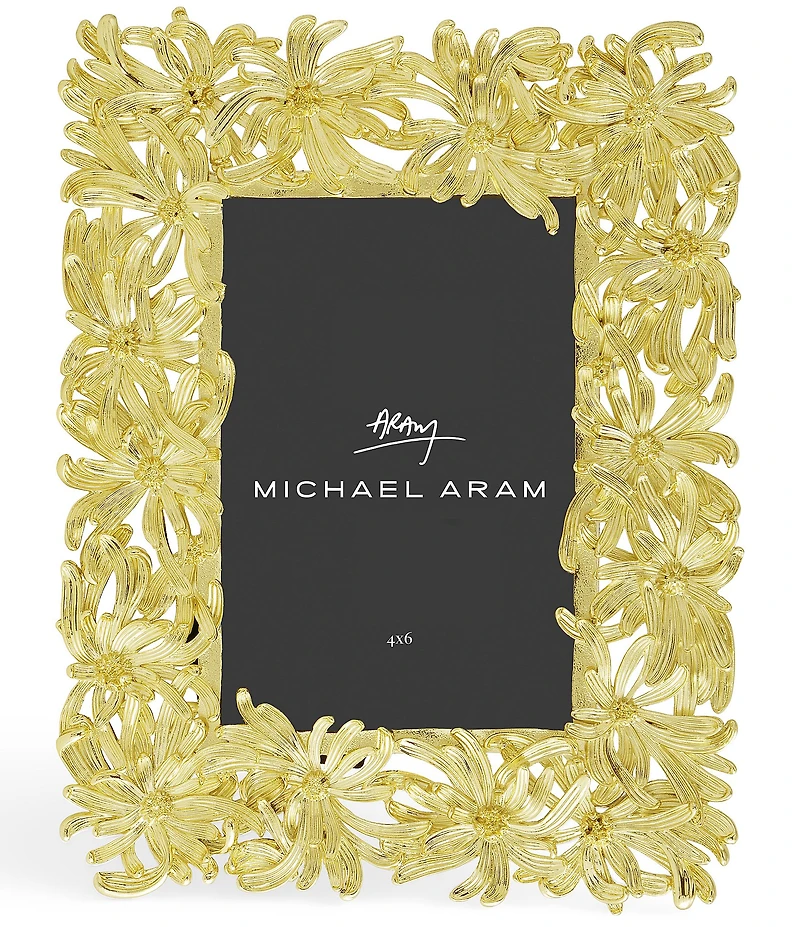 From the Dahlia Collection by Michael Aram, this frame features: The Dahlia 4x6 Frame is a romantic expression of luxury and craftsmanship. Handcrafted in goldtone with intricate detail, it echoes the dahlia's timeless symbolism of love and devotion. Each petal reflects nature's harmony, elevating your most cherished memories with radiant beauty. Zinc Goldtone Gold petal pattern Perfect for gifting Wipe clean Measures approx. 9.25" L x 7" W holds 4 x 6 photo Imported
