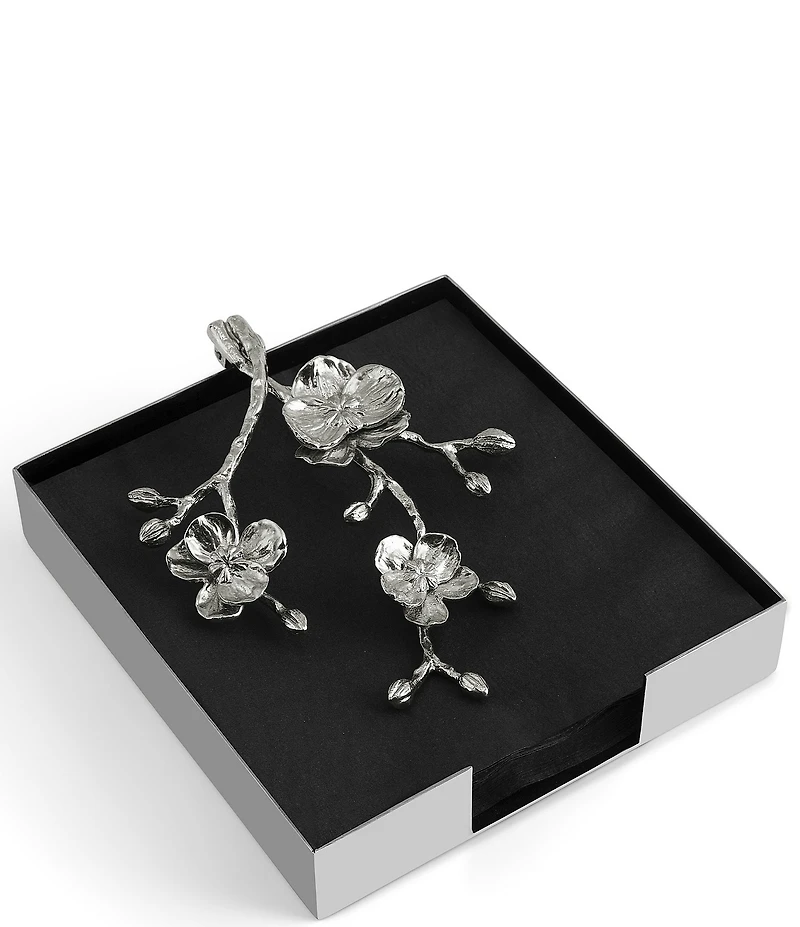 From the White Orchid Collection by Michael Aram, this napkin holder features: The White Orchid Napkin Holder is a refined balance of artistry and function. Handcrafted in stainless steel with sculpted orchid accents, it embodies purity, grace, and new beginnings. Delicate yet enduring, this piece elevates both everyday dining and special occasions, capturing the orchid’s ethereal beauty in timeless form. Stainless steel Nickel plate powder coat Sculpted orchid accents Black napkins included Hand wash Approx. 7.25" L x 6.5" W x 2" H Imported.