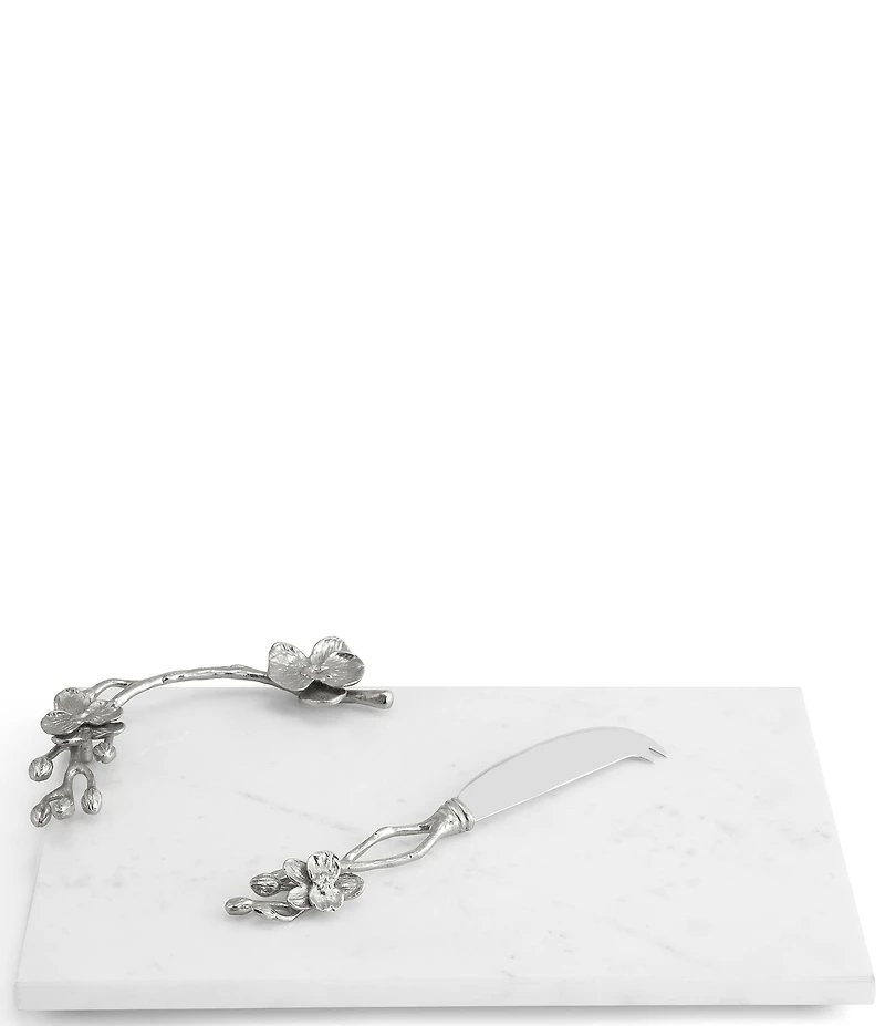 From the White Orchid Collection by Michael Aram, this cheese board and knife set features: Handcrafted from Michael Aram's Orchid Collection, this White Orchid Cheese Board celebrates the ethereal elegance of orchids. Each piece reflects purity, grace, and subtle mystery, making it perfect for serving cheeses or small bites.The accompanying knife complements the sculptural design, turning every gathering into an artistic experience. Marble Nickel plated Stainless steel Sculpted orchid accents Makes a great gift Hand wash Each measures approx.: Board 18" L x 10" W x 1.5" H Knife 8.5" L Imported.