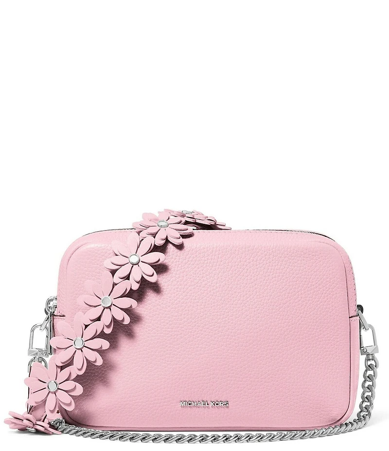 From Michael Kors, the Bryant Medium Double Zip Camera Crossbody Bag features: Pebble embossed leather 100% cow leather 2 zip closures Silver hardware 1 interior back slip pocket 1 exterior back slip pocket Adjustable detachable crossbody strap approx. 13" - 23" drop Approx. 7.5" L x 5" H x 3.25" W Imported.