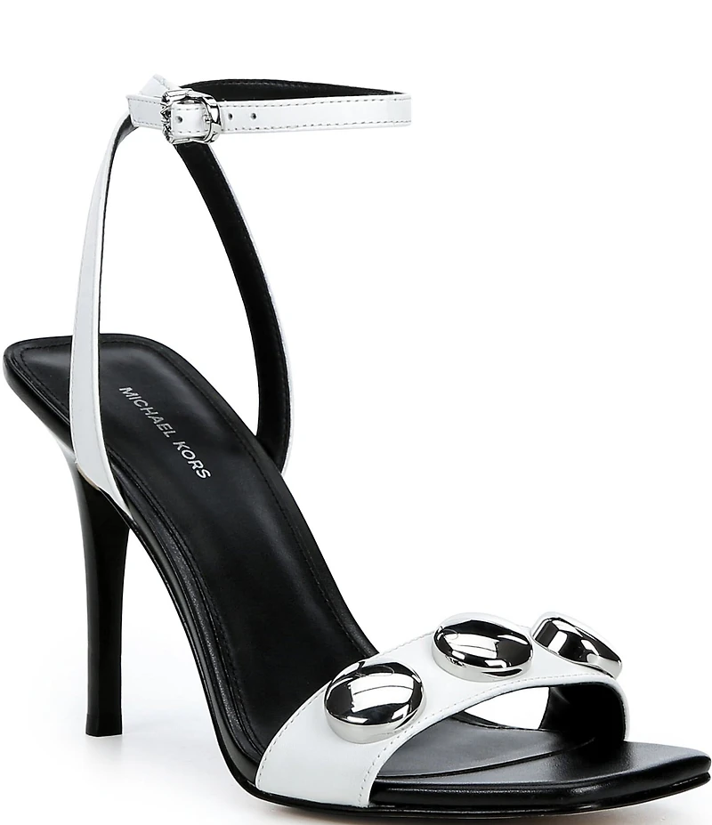 From Michael Kors, the Liana Leather Dome Studded Sandals feature: Vachetta leather upper Dome stud hardware Adjustable buckled ankle strap closure Synthetic lining Rubber outsole Approx. 4" stacked stiletto heel Imported.