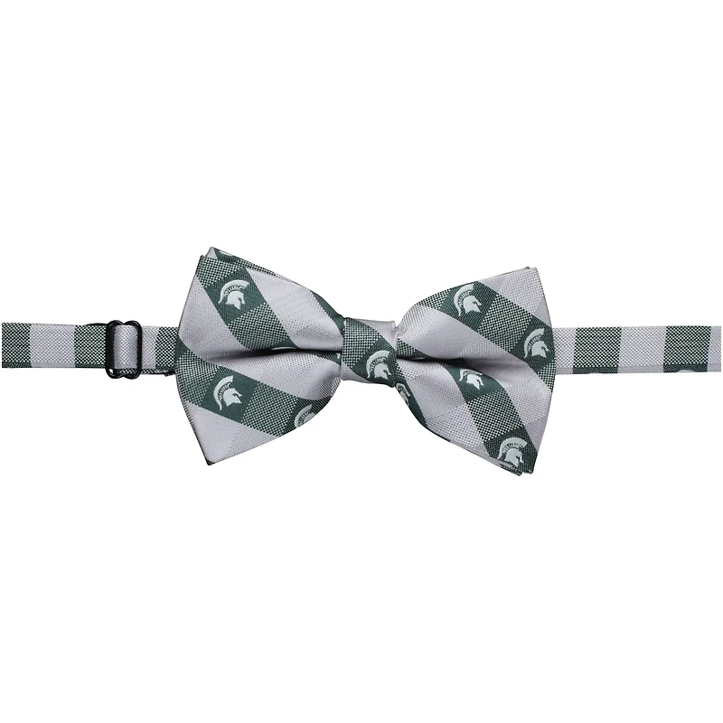 Cheer on your Michigan State Spartans with this Check bow tie Bring some formal to your fanaticism with the bold Michigan State Spartans colors and embroidered graphics on this bow tie Don't be afraid It's a clip-on so you don't have to worry about learning how to tie a bow tie It is adjustable to fit just about any Michigan State Spartans fan