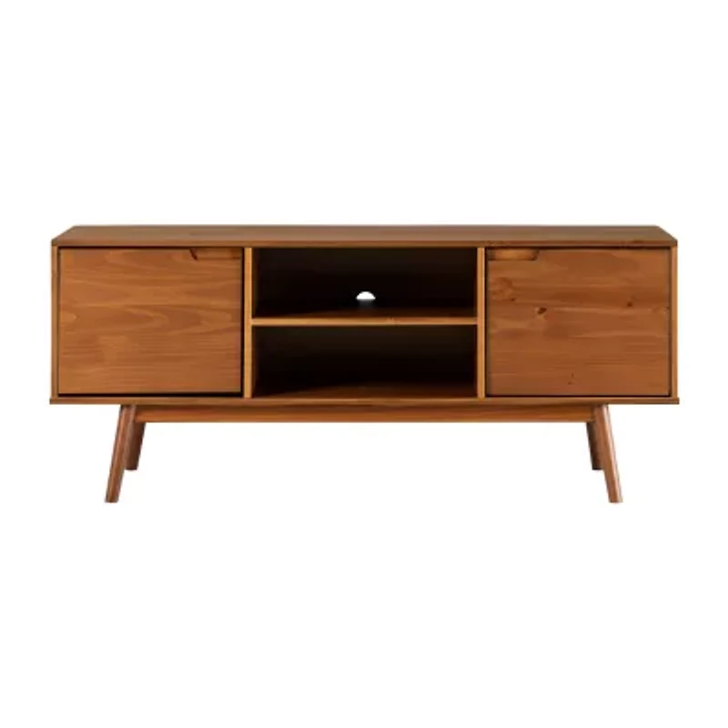 Gather your family around to watch your favorite throwbacks around this mid-century modern tv stand. Cutout handles offer easy opening of the two doors with adjustable soft-close hinges and provide a simple, modern aesthetic to your living room. Tapered angled legs enhance the entertainment console's retro vibes. Make movie nights easier with media components on the two adjustable shelves or the center open fixed shelf. You'll love the solid pine wood build because of its long-lasting quality.