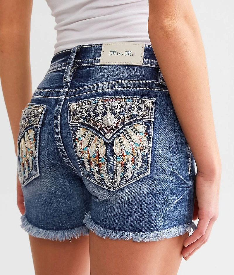 Mid-rise Slim through the hip and thigh 4" midi short Rhinestones and sequins on metallic color pop stitch embroidered faux flap back pockets Fraying details