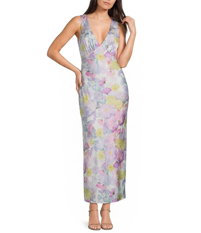 Midnight Doll Satin Floral Printed V-Neck Draped Back Maxi Dress