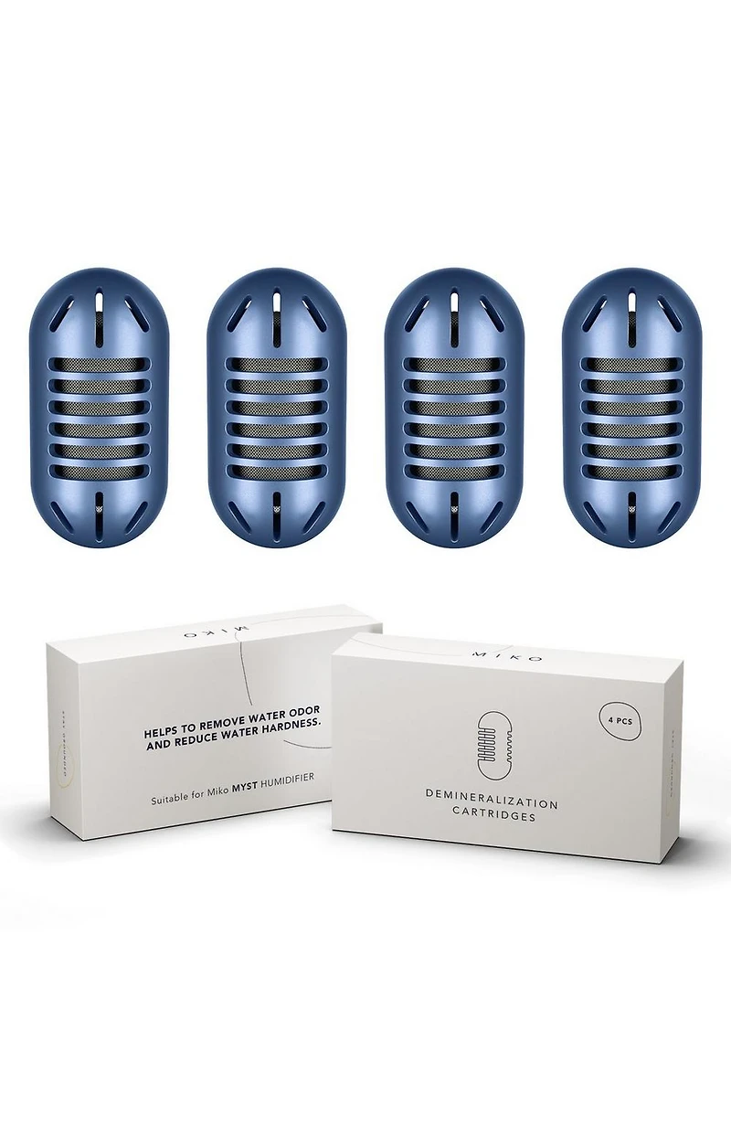 Water Demineralization Cartridges - 4-Pa. Benefits: Maintains consistent, clean humidity for better air quality. Extends the life and efficiency of your humidifier. Features: Reduces mineral buildup and white dust. Helps soften water for optimal humidifier performance. Easy drop-in design. Provides consistent, clean humidity. Each pack includes four cartridges. Each cartridge lasts 3040 uses. Compatible with Miko Myst Humidifier. Works with all ultrasonic humidifiers. Prolongs humidifier lifespan. Ensures fresher, healthier mist. :