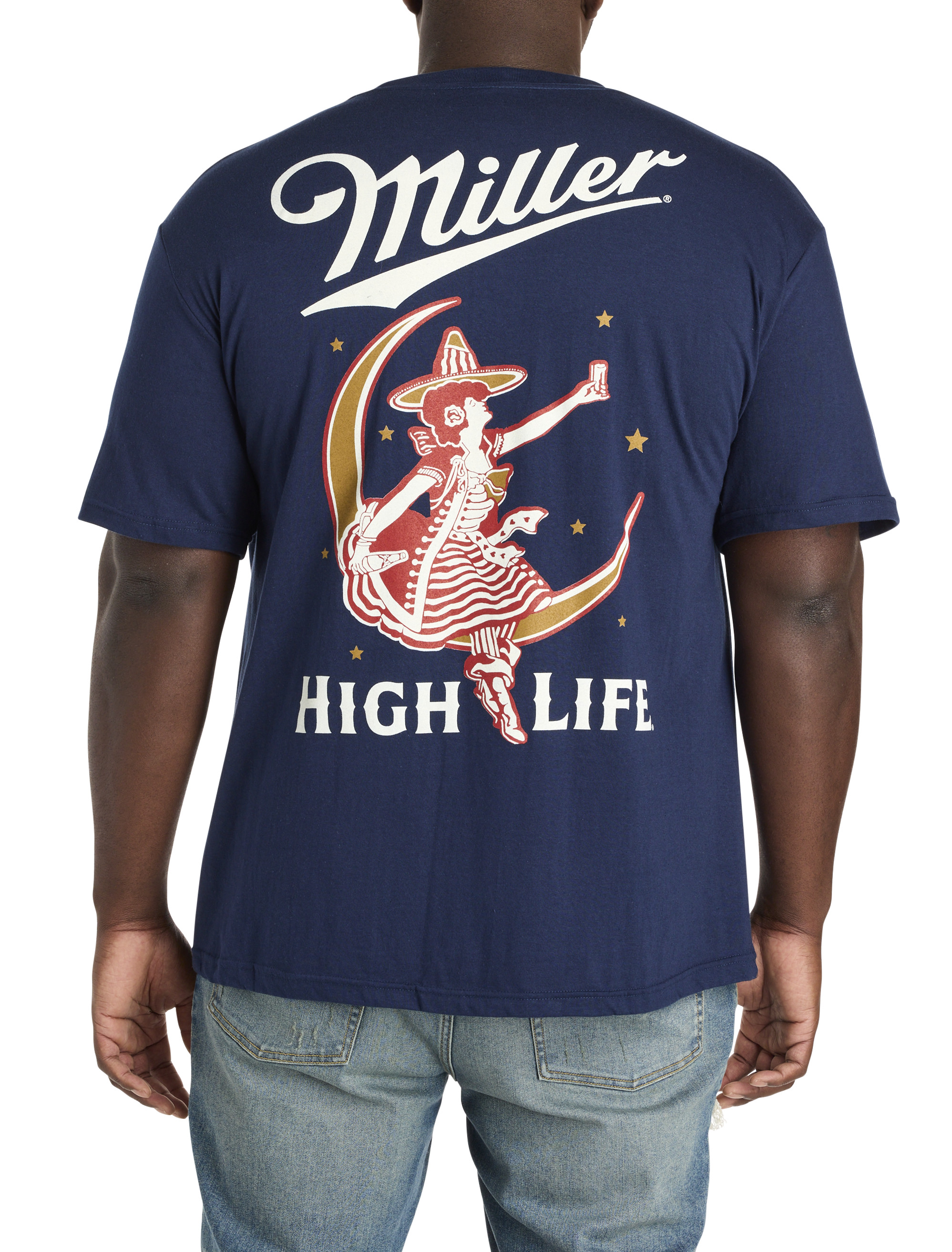 No matter what time it may be, make it Miller time with this graphic T-shirt. Sit back, relax and enjoy a cold one in comfort. Designed with the Miller High Life beer logo screenprinted at the left chest and on back, it's crafted in 100% cotton with a relaxed, roomy fit that's built for Big and Tall guys.