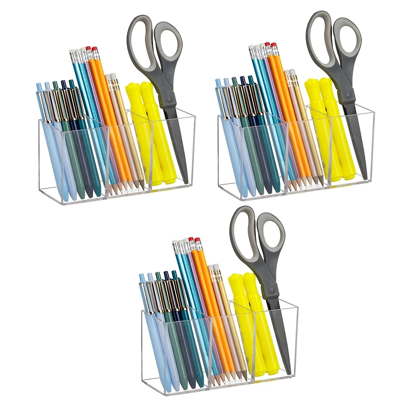 Set of 3 Clear Acrylic Desk Organizers for Office, Vanity, or Kitchen Organize your space with this set of three Mind Reader Clear Acrylic Desk Organizers. Each unit features three compartments designed to keep pens, sticky notes, binder clips, or makeup brushes neat and accessible. The transparent acrylic design blends seamlessly with any room décor and adds a touch of modern style. Perfect for use in the office, at your vanity, or around the kitchen, these organizers provide versatile storage wherever you need it. Lightweight and ready to use with no assembly required, they're an ideal solution for keeping small items tidy across multiple rooms or workstations. Three-compartment layout: Each organizer keeps essentials like pens and brushes separated and easy to reach. Versatile multipack: Set of 3 ideal for use in the office, bathroom, kitchen, or classroom. Clear acrylic style: Sleek transparent design complements any workspace or home decor. Ready to use: No assembly required and lightweight enough to move or reposition easily. Compact and coordinated: Each organizer measures 7"L x 2.5"W x 3.5"H (17.8 x 6.4 x 8.9 cm) for efficient use of space.