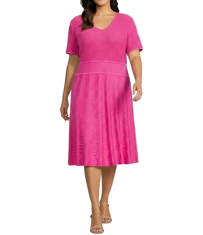Ming Wang Plus Size Soft Linear Knit V-Neck Short Sleeve Fit & Flare Midi Dress