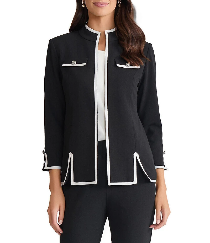 From Ming Wang, this jacket features: Stretch deco crepe fabrication Contrast trim Stand collar neckline Bracelet sleeves Front faux pockets Princess seaming Signature button detail Front cutout hem detail Straight hem Hook front closure Approx. 25" length Polyester/spandex Hand wash Imported.