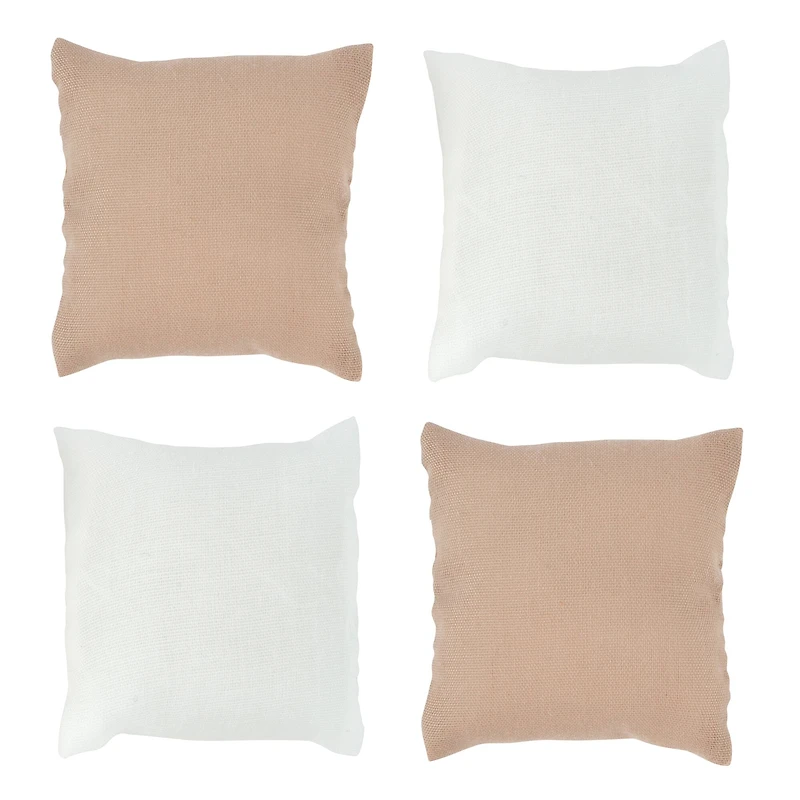 Bring warmth and charm to a dollhouse or miniature cottage with this darling mini throw pillow set from Make Market. Pair these cushions with a cozy upholstered sofa, accent tables and an area rug to complete your tiny living room display.Details:Beige and cream4.5" x 6" (11.4cm x 15.2cm) package size4 pillowsScale: 1:12PolyesterNot a toyFor decorative use only