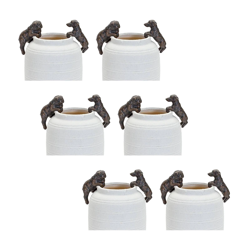 This adorable set of dog pot hangers is the perfect addition to your home décor. Featuring two assorted designs, the dogs include a bulldog and a Dachshund. The rustic brown finish paired with the whimsical hanging dog design is the perfect combination to create a stunning display. Hang the pieces from your plant pots or vases to complete the look. Details:Brown dog designs6 setsLime powder and resinSuitable for indoor and outdoor covered useSize Information:3.5" x 1.25" x 2"3.75" x 1.75" x 2"
