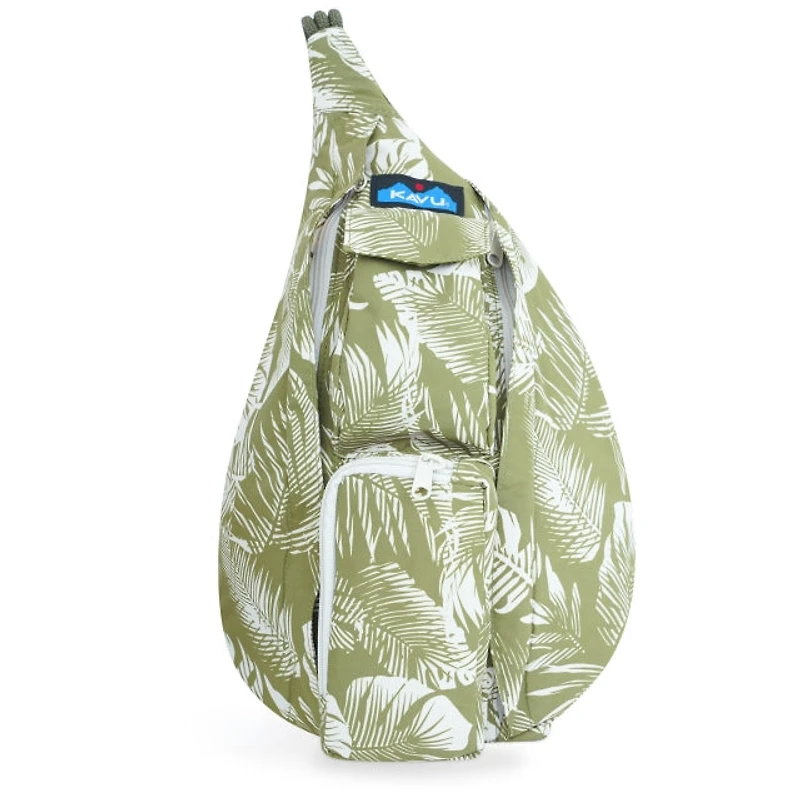 Mini sling pack with adjustable rope shoulder strap and side release buckle, elastic webbing keeper at strap end, two key or cell phone pockets, padded back with KAVU embroidery