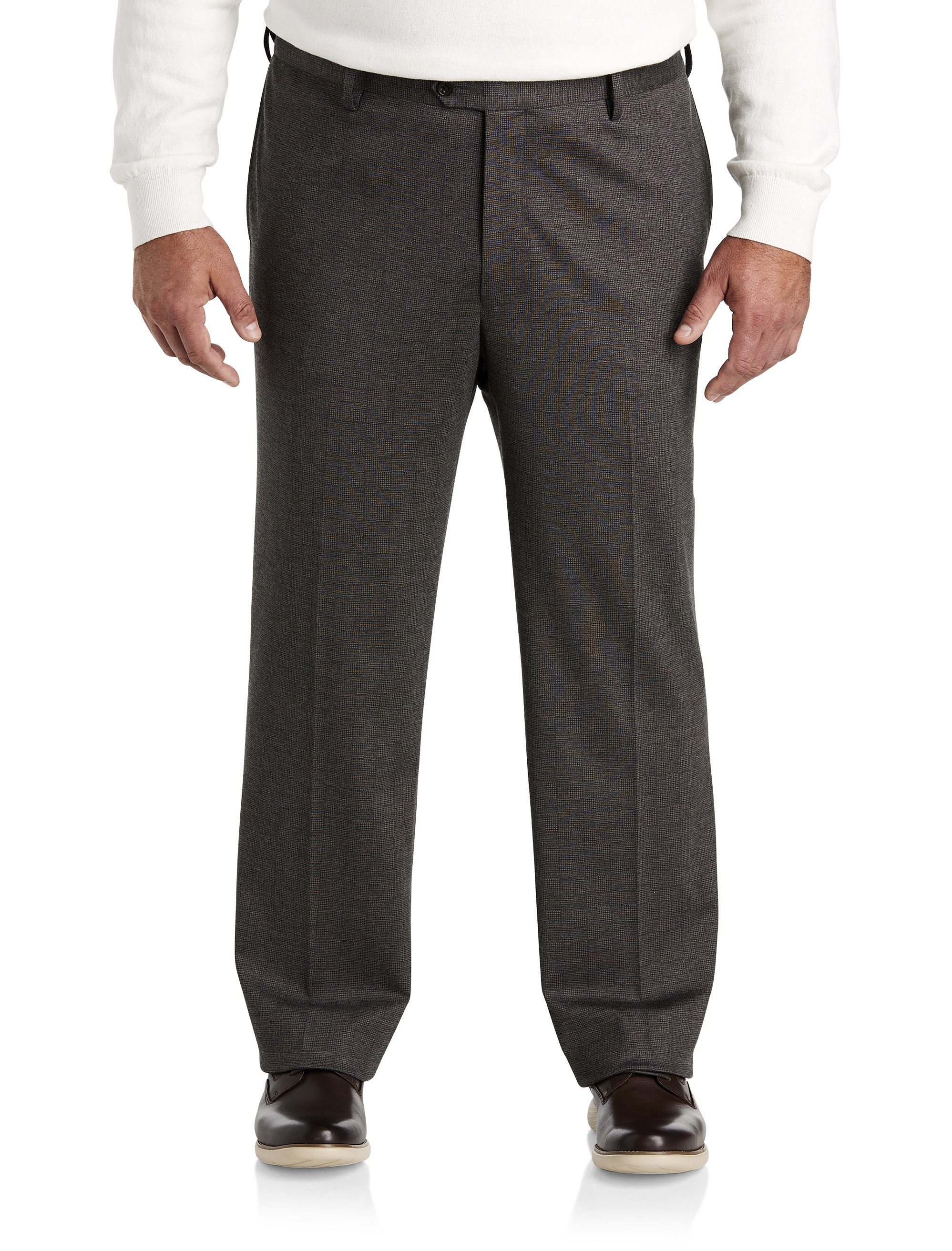These Oak Hill dress pants are a modern style in a better-proportioned fit, with updated measurements to ensure little to no alterations. They're designed right here at DXL and made specifically for the Big and Tall man. We've updated the classic flat-front style with a bit of stretch for a more streamlined look and comfortable feel. They feature a hidden waist-relaxer comfort waistband that stretches up to 4" and the 32" inseam can be easily altered to 34" to better fit our taller guests.