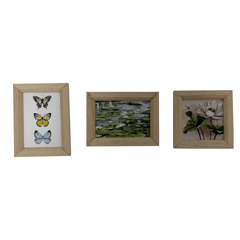 Add dimension to your miniature's wall with this set of three wall art pieces from Make Market. This set includes three different-sized framed artworks you can hang on an accent wall. Pair these mini wall art pieces next to a miniature mirror to create an inviting display.Details:Brown, green, and whiteScale: 1:123 piecesFor decorative use only. Not a toy.Birch, plywood, and paperSize Information:2.5" x 3.15" (6.4cm x 8cm)2.5" x 4" (6.4cm x 10.2cm)3" x 3" (7.6cm x 7.6cm)