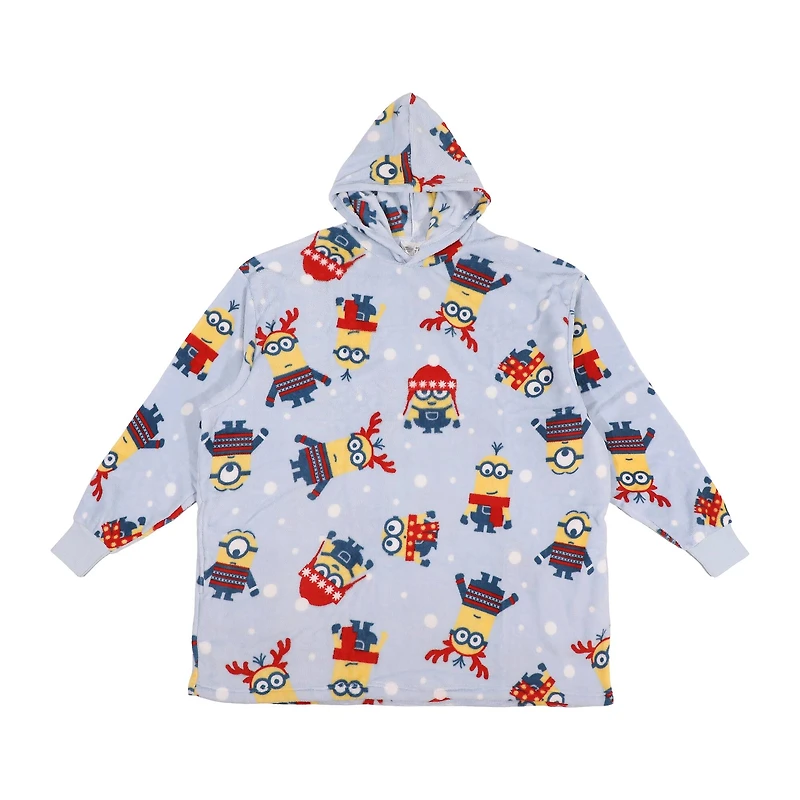 Ring in the season with the Minions and their brand of festive mayhem by donning this playful oversized hoodie at parties and get togethers this Christmas. With a toss of the mischievous workers in various winter accessories on an icy blue background, this cozy top is perfect for cuddling up by the fire with your favorite hot beverage or holiday story time with the family.Details:Christmas Minions toss on icy blueOne size fits most adultsCozy hood and pockets100% polyester fleeceOfficially licensed