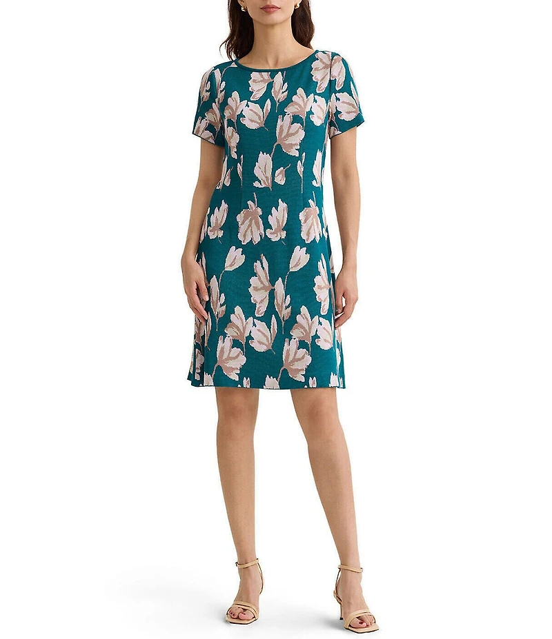 From MISOOK, this dress features: Soft knit fabrication Floral pattern Boat neckline Mid-bodice darts Short sleeves A-line silhouette Unlined Pullover construction Approx. 37" length Rayon/polyester Machine wash Imported.