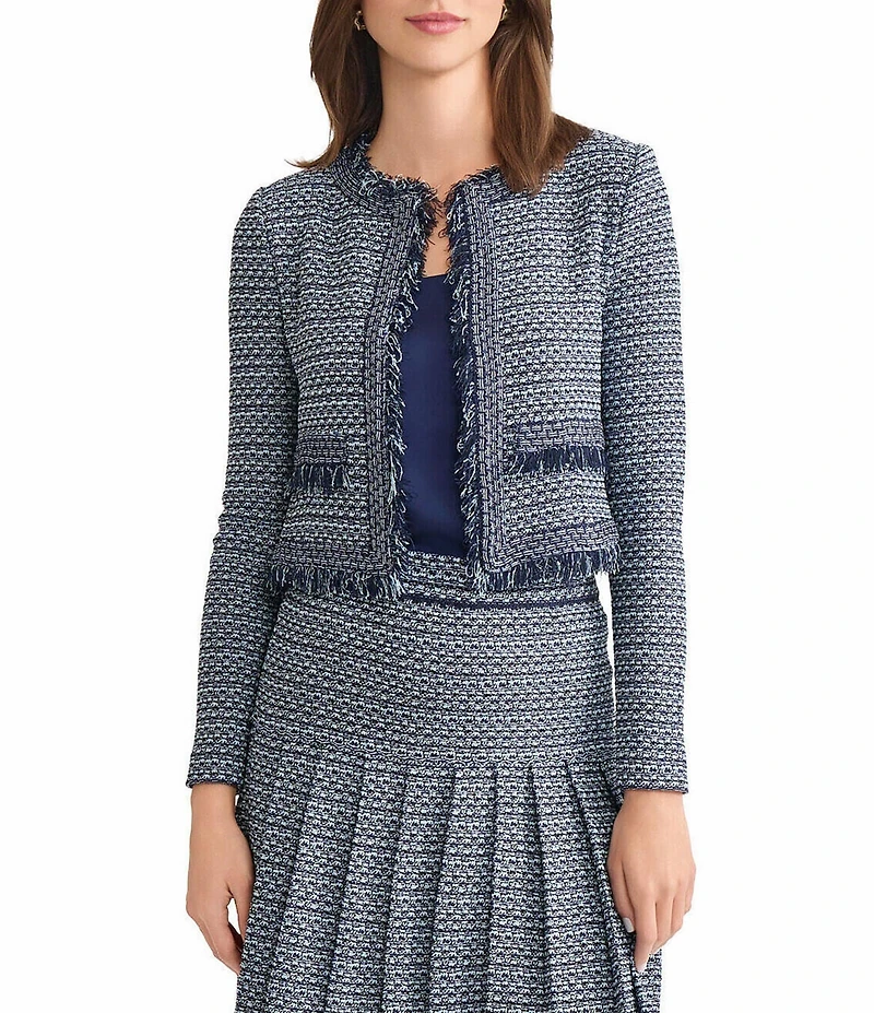 From MISOOK x Lani Lynn, this jacket features: Tweed knit fabrication Heritage silhouette Round neckline Long sleeves Soft shoulder pads Faux front pockets Fringe trim Hook front closure Approx. 18" length Acrylic/nylon/rayon Hand wash Imported.
