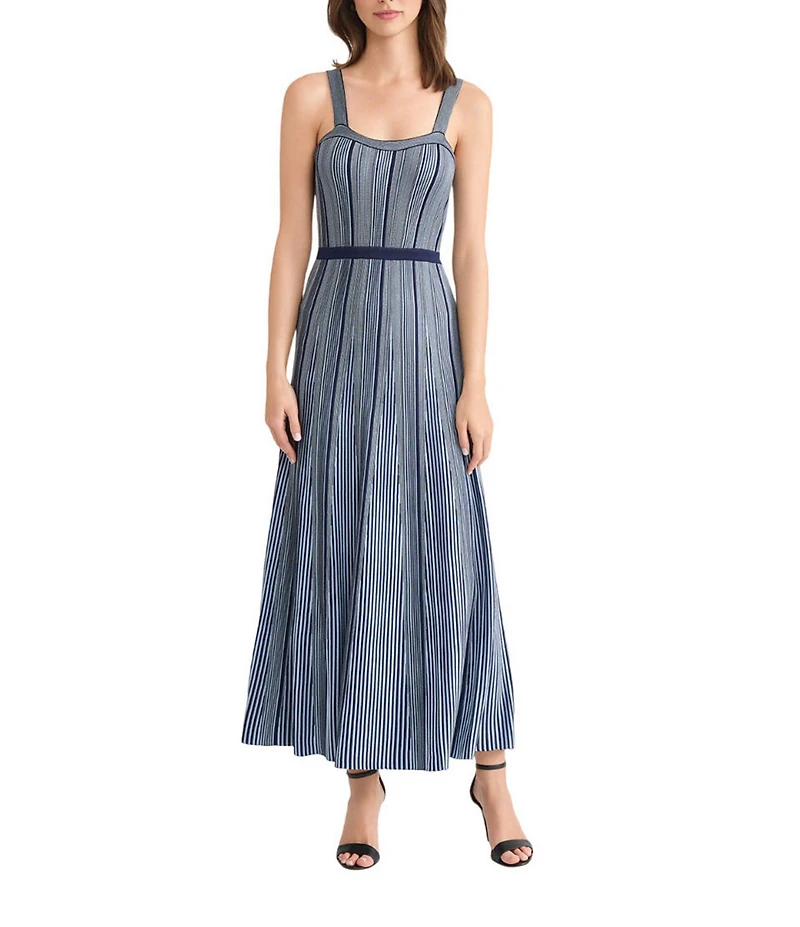 From MISOOK x Lani Lynn, this dress features: Vertical stripe knit fabrication A-line silhouette Sweetheart neckline Sleeveless Straight hem Pullover construction Approx. 52" length Viscose/nylon Hand wash Imported.