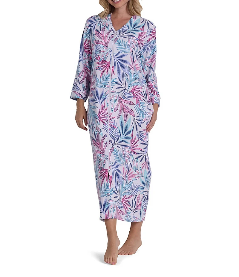 Miss Elaine Palm Fronds Print 3/4 Sleeve V-Neck Interlock Knit Long Zip Robe