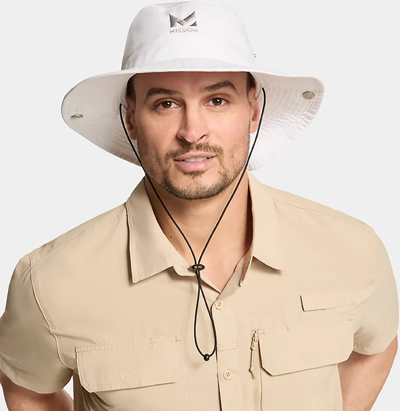 Stay cool and dry in the MISSION Men's Cooling Bucket Hat, which is made of 100% polyester ultrawicking Eventrue fabric that pulls sweat from the body for quick drying and features proprietary inner fabric that cools instantly when soaked with water, wrung out and snapped in the air. UPF 50 sun protection.