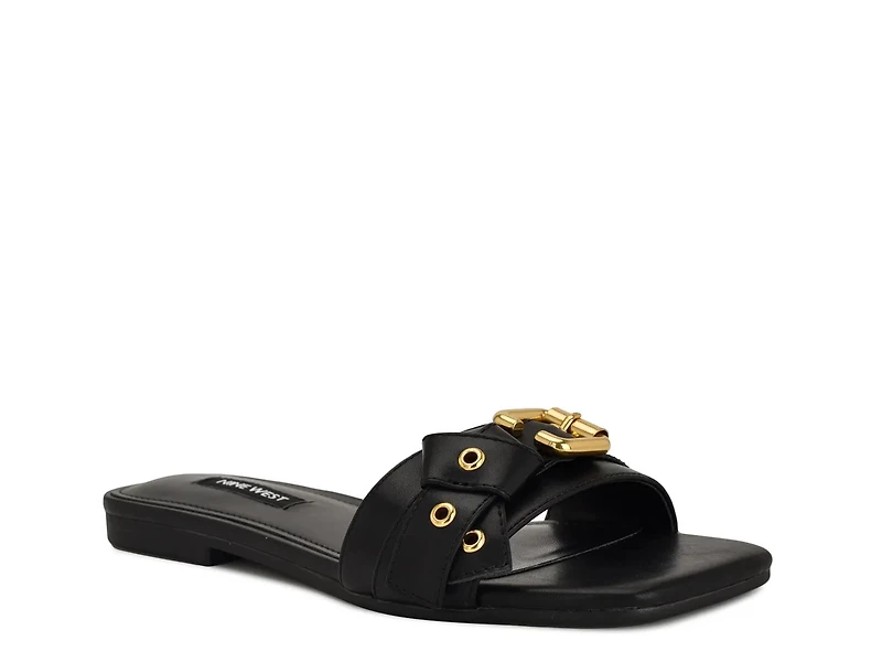 The Nine West Missj sandal brings touch of refined grace to every stride. Boasting a woven strap with grommet and buckle accents, this slide sandal features a square open toe and low block heel for a fashion-forward look.