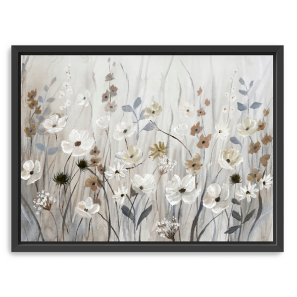 Give your space a fresh look with this Misty Meadow Black Framed Canvas Art Print. The delicate flowers will quickly become the centerpiece of any room! Overall dimensions Width: 42" Depth: 1.75" Height: 32" Giclee printed on stretched canvas Black frame around wrapped canvas Floral subject Hues of gray, white, brown, blue, and black Weight: 17.81 lbs. Hangs from back-mounted hardware Care: Dust with a soft, dry cloth. This item is available at Kirklands.com only, not available in stores. Please note: this item cannot be shipped to APO/FPO addresses.