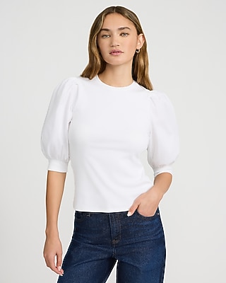 A classic fitted ribbed tee in a modern silhouette with smooth, short puff sleeves. This crew neck style is a versatile pick for styling with your favorite denim or trousers.