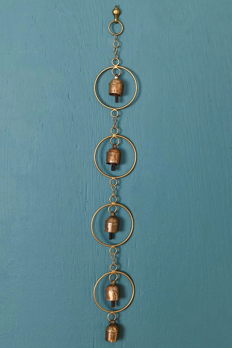 Bring soft, grounding sound and global artistry into your space with this handcrafted circular bell chime mobile. Made in India, this hanging piece features a series of rustic metal bells suspended within open circular frames, creating a beautiful balance of movement, shape, and sound. Traditionally, these brass and copper-toned bells were used to adorn domestic animals and mark the entrances of homes, offering both decoration and gentle, protective sound. Each bell is carefully handcrafted by artisans using time-honored techniques. A strip of iron is hammered until pliable and formed into a cylinder, then topped with a hand-shaped dome and secured together, with a loop added for hanging. The circular design adds a modern, airy feel while enhancing the soft chime of each bell as they move with the breeze. Perfect for doorways, patios, or indoor spaces, this metal bell wind chime doubles as a striking accent for bohemian style home decor, meditation spaces, or entryways. Both decorative and meaningful, it brings a sense of calm, tradition, and intentional sound into your everyday environment.