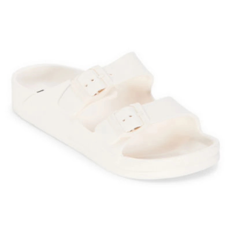 This sturdy comfortable pair of Mixit women's slip-on sandals are perfect for pool or beach days. Made from a durable eva material, these shoes have two buckle straps and a comfortable flat platform sole. Wear them with a skirt and tee or dress.