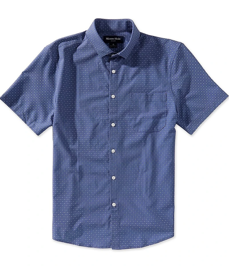 From Mizzen+Main, this shirt features: Allover medallion print Hidden button-down collar Short sleeves Button-front closure Pocket at left chest Darts at back Wrinkle-resistant Quick-drying Stretch Polyester/spandex Machine wash/tumble dry Imported.