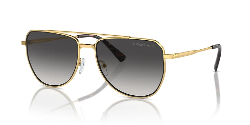 Elevate your style with the Michael Kors MK1155 Whistler sunglasses. These pilot-shaped frames boast a teardrop lens design and a sleek double bridge, exuding timeless sophistication. Crafted from lightweight metal in a luxe gold tone, they feature an elegant two-tone finish and narrow temples for a refined touch. The grey gradient lenses add versatility and a modern edge, while sunglasses' adjustable nosepads ensure a comfortable fit. Perfect for a polished look, these gold sunglasses seamlessly blend classic charm with contemporary appeal.
