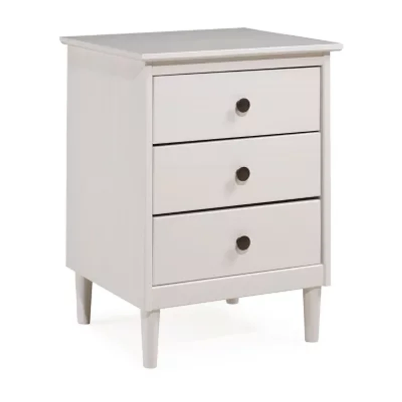 Add a classic touch to your bedroom, with our mid century modern 3-drawer wood nightstand. Crafted from solid pine and manufactured wood, with a painted finish, rooted in traditional style. Features centered knobs on each drawer, stained for a long-lasting finish, and short, tapered legs. Its simple style makes it easy to work with a variety of other styles, including transitional and modern. You'll have easy access to your phone, alarm clock, and lamp by positioning this nightstand next to your bed.