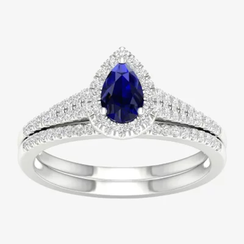 Modern Bride Gemstone Womens 1/3 CT. T.W. Lead Glass-Filled Red Ruby 10K White Gold Pear Halo Bridal Set