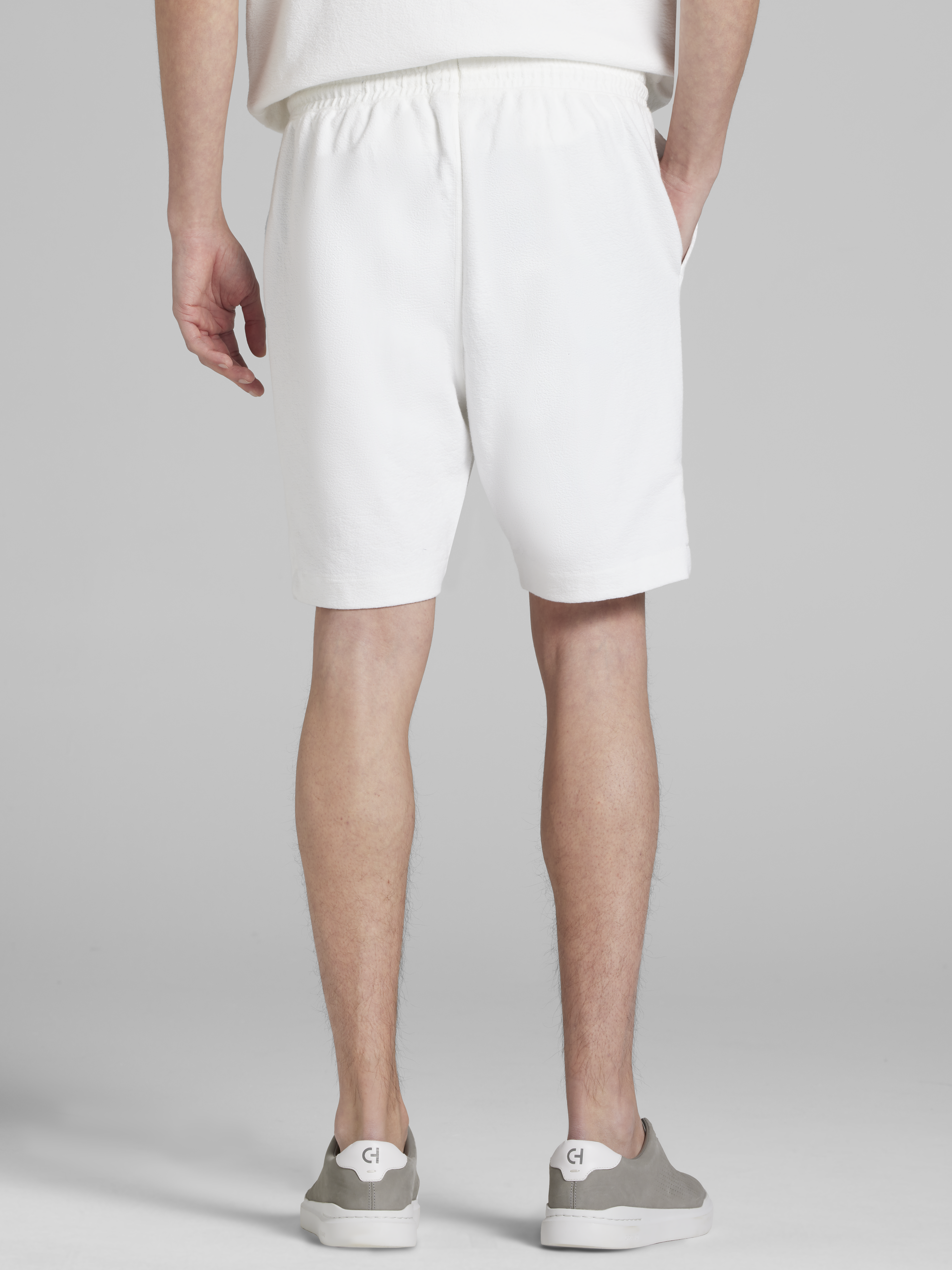 These Modern Fit French Terry Camp Shorts strike the perfect balance between laid-back comfort and refined minimalism. With a flat-front design and a gathered elastic waistband, they're your go-to for fuss-free, pull-on ease. Thanks to the above-the-knee cut and straight silhouette, they add a touch of sophistication to your casual wardrobe. Slant pockets offer practicality, while the understated drawstrings complete the contemporary vibe. Whether lounging or heading out, these shorts are all about keeping it effortlessly sleek. Quiet luxury never looked so good.