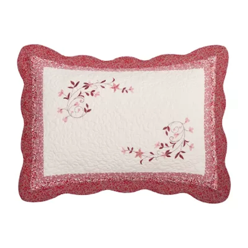 Bring a decorative focal point to your room with this pieced traditional dahlia design pillow sham. Embroidered red floral scrolls frame the radiating center pieced dahlia design. Floral prints in shades of red make up the border while a gentle scalloped edge gives this sham a soft detail. Intricate vermicelli quilting covers everything beautifully. 100% cotton face and fill with a brushed polyester backing.