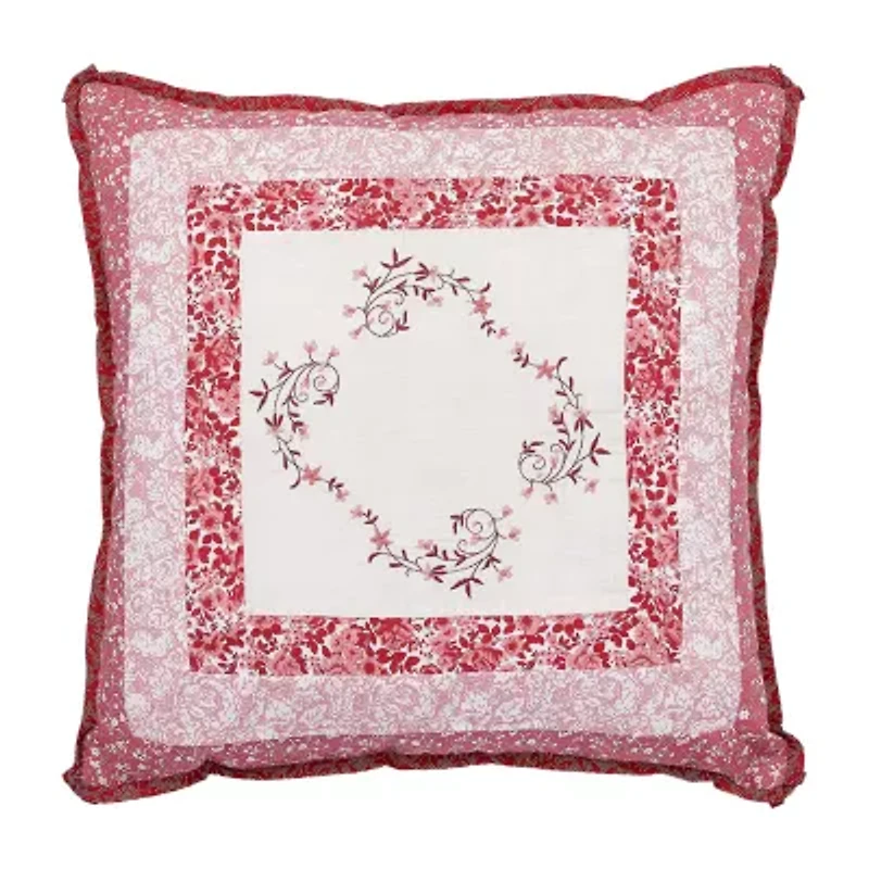 This soft and lovely square pieced decorative pillow coordinates with the Caroline bedspread. The beautiful center of this pillow has embroidered red floral scrolls on white that echo the embroidery of the bedspread. Pieced lighter red floral fabrics from the top of bed design frame the embroidery in a charming border pattern. A light red floral print from the front design creates the reverse. 100% cotton face with polyester back and fill.