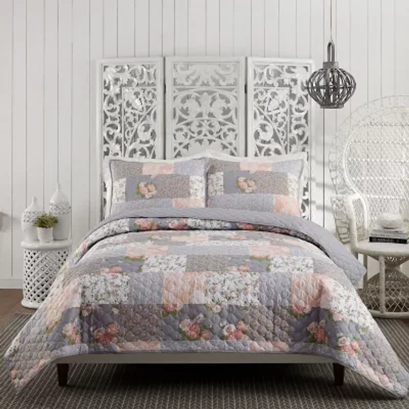 Add a romantic English garden ambience to your bedroom with the la flor 3-piece quilt set. A mix of lovely, vintage floral prints are beautifully blended to create a timeless heirloom masterpiece. Printed on super soft 100% brushed microfiber polyester for easy care. Reverses to solid soft gray. All four sides of the quilt and sham are secured with a gray binding for extra quality and value. Set includes a quilt and two coordinating pillow shams.