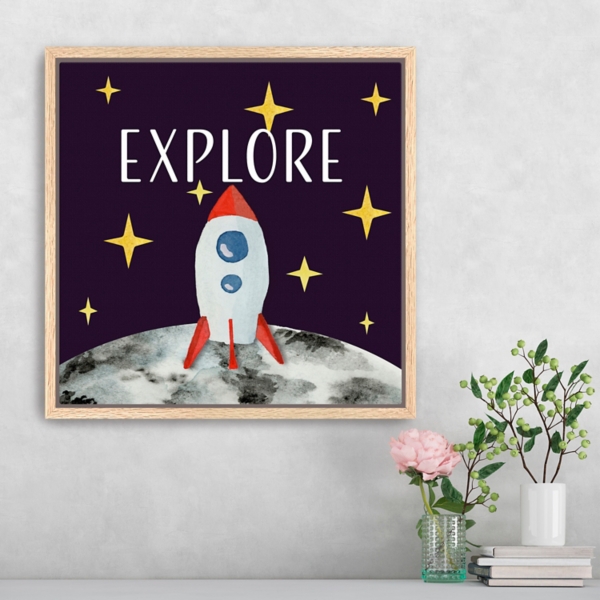 Decorate your child's room with the Moon Rocketship Kids Framed Canvas Art Print! Its cute rocketship design will launch their imagination for their next play time. Overall dimensions Width: 22 in. Depth: 1.75 in. Height: 22 in. Distinctively printed on stretched canvas Natural wood frame around wrapped canvas Features the word " Explore" with a rocket on the moon Hues of black, gray, white, red, blue, and gold Weight: 12.76 lbs. Hangs from back-mounted hardware Care: Dust with a soft, dry cloth. Avoid exposure to heat, direct sunlight, and moisture. This item is available at Kirklands.com only, not available in stores. Please note: this item cannot be shipped to APO/FPO addresses.
