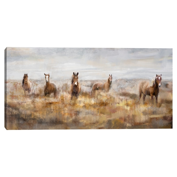 Transform any spot in your space into your very own art gallery with our Morning Herd Canvas Art Print. You'll love having this stunning art print hanging in your home. Art measures 54L x 1.5W x 27H in. Printed on stretched, polycotton blend canvas Wrapped edges complete the look Features horse herd subject Hues of tan, brown, white, and blue Weight: 9 lbs. Hanging hardware not included Care: Dust with a soft, dry cloth. This item is available at Kirklands.com only, not available in stores. Please note: this item cannot be shipped to APO/FPO addresses. WARNING: Cancer and Reproductive Harm - For more information go to www.P65Warnings.ca.gov .