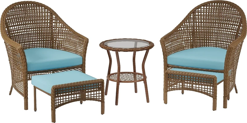 - Brown wicker with turquoise cushions and smoky glass tabletop