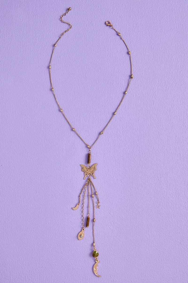 Moss Agate Gold Butterfly Lariat Necklace