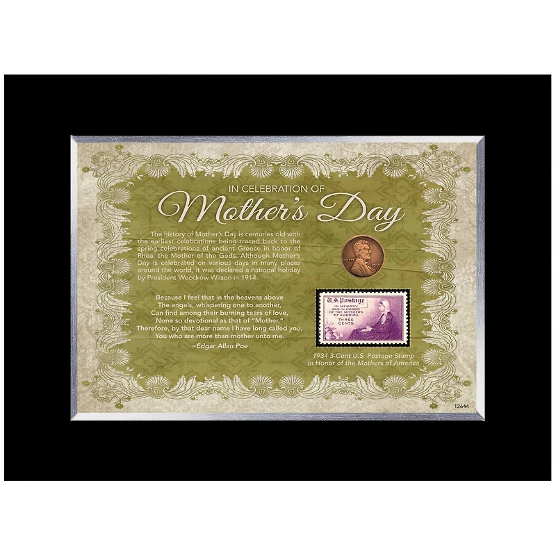 President Woodrow Wilson declared May 9 as the official national holiday to celebrate Mother's Day. Show your mom how much you love her and give this memento from history. The black desk frame contains a genuine 1914 Lincoln Wheat Penny and a mint Mother's Day stamp issued by the US Post Office created in 1934. The frame has an easel back and also features a beautiful poem by Edgar Allen Poe. The Lincoln Wheat Penny is composed of copper and was minted from 1909-1958. The Mother's Day Stamp was modeled after Whistler's mother and is in honor of the mothers of America.