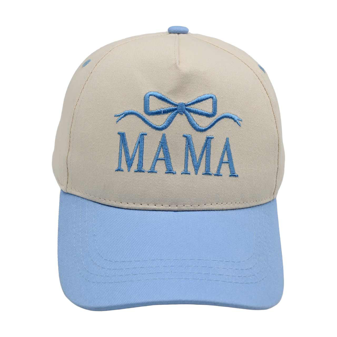 The cap features a delightful two-tone design with a soft beige crown and a pastel blue brim, creating a fresh and modern look that complements any casual outfit. Embroidered on the front in elegant blue stitching is the word "MAMA," adorned with a cute bow above it, adding a touch of playful charm and feminine flair.